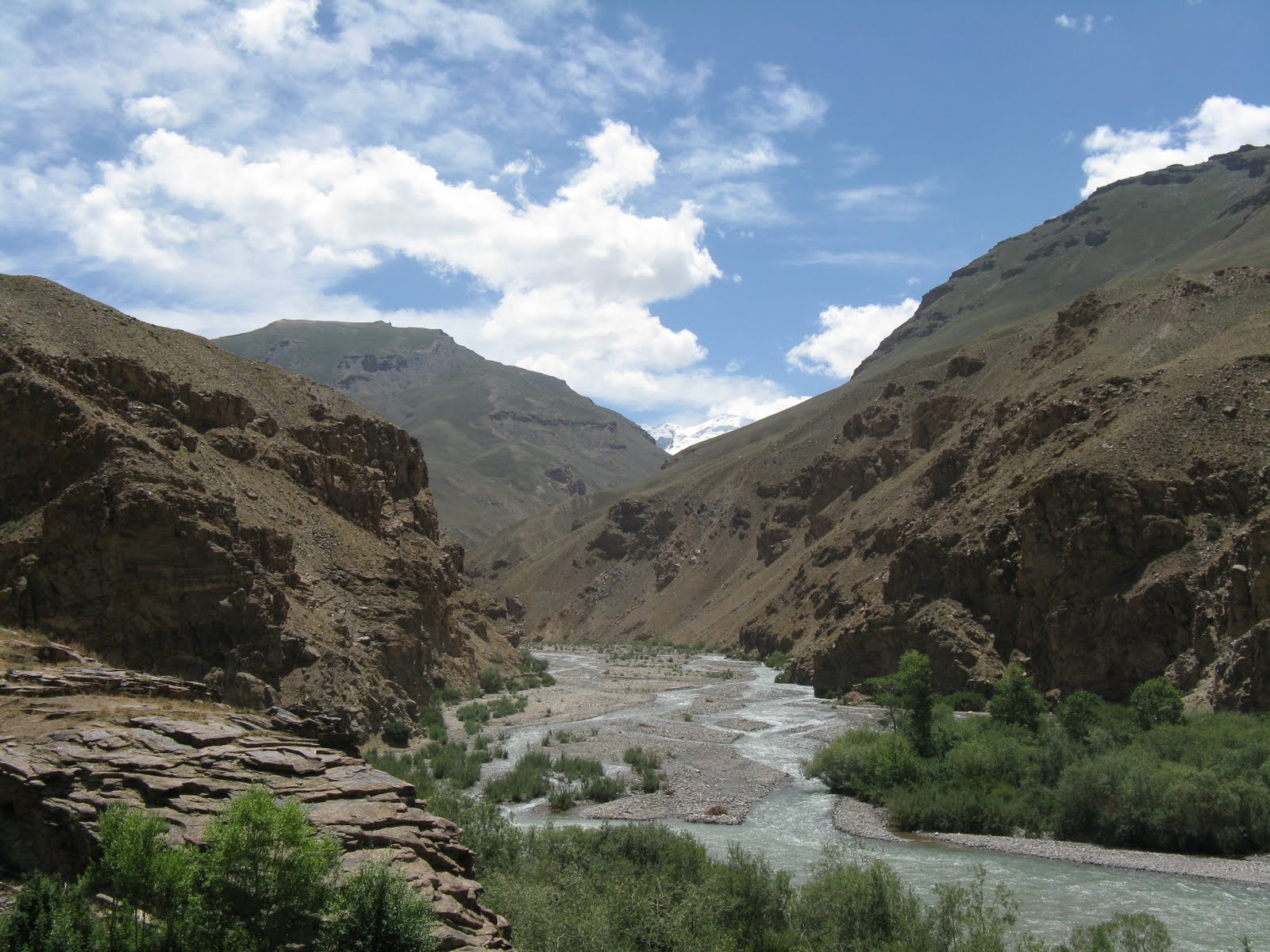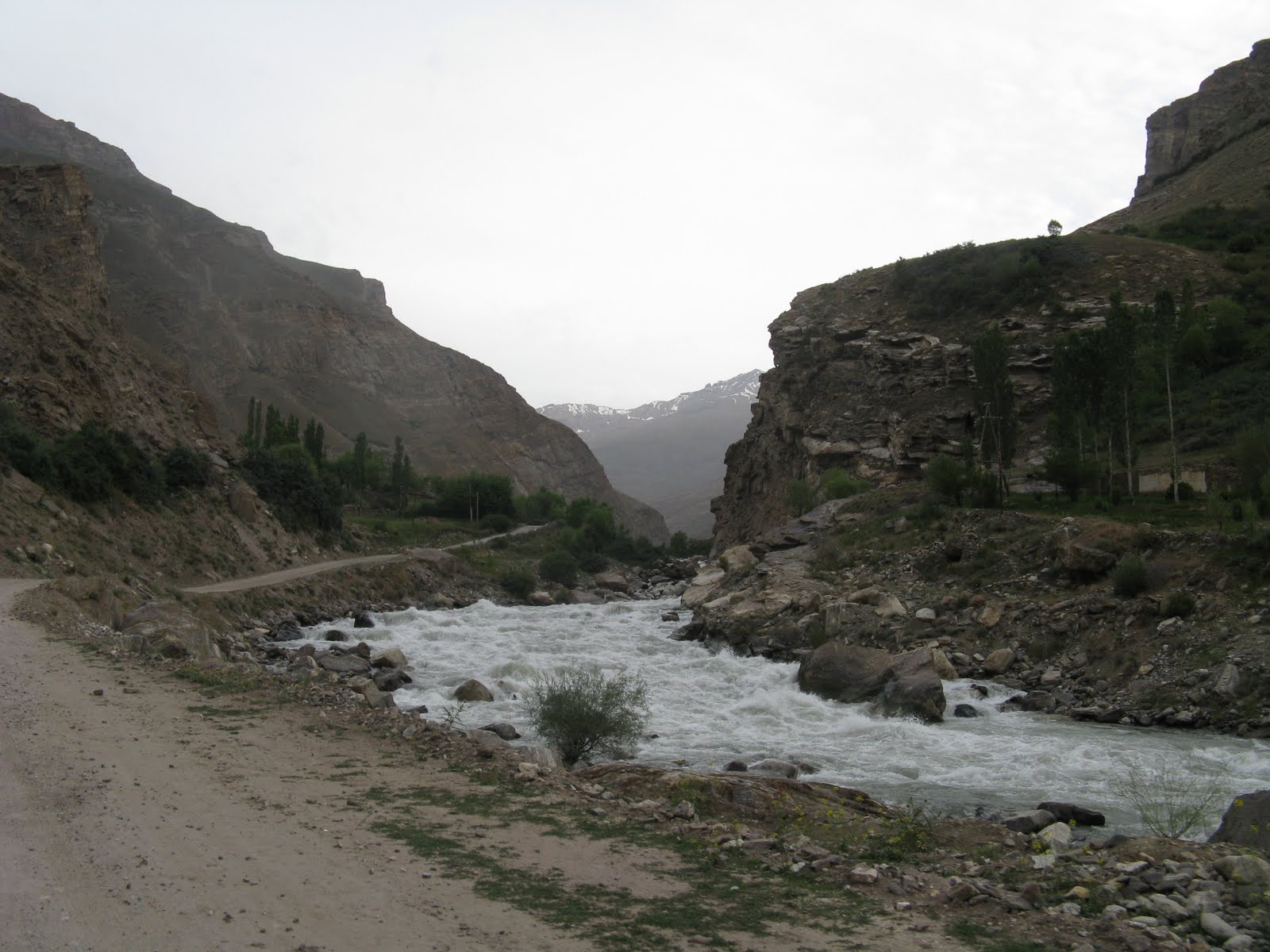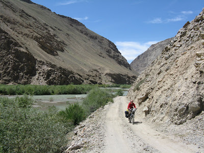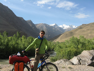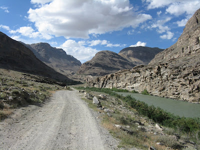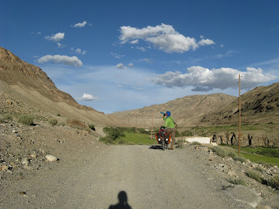 Für den Weg ins Shokdaratal nach Roshtkala frage ich zur Sicherheit immer mal wieder ein paar Passanten, aber eigentlich ist er gut zu finden. Es geht sogar auf Asphalt den Fluss entlang hoch. Am Polizeiposten hinter Khorog bekommen wir noch ein Stück Wassermelone in die Hand gedrückt. Nach dem üblichen Eintrag ins Journal geht es weiter. Es ist schön zu sehen, wie das Tal noch intensiv genutzt wird, auch an den Hängen gibt es immer wieder Bewässerungskanäle. Bei einer Pause kommen unsere Ukrainskies wieder vorbei, die wir wiederum später bei ihrer Pause passieren. In Roshtkala gehe ich nochmal in den Markt, um ein letztes Mal RC-Cola zu kaufen, leider gibt es die hier schon nicht mehr, das dürften jetzt längere RC-freie Zeiten werden. Dafür gibt es noch sehr schönes Gemüse. An der letzten Tanke wird nochmal vollgemacht. Dort treffe ich einen Jeepfahrer, der meint, er hätte in Shavjangoz ein Haus und wir sollen ruhig bei ihm vorbeischauen. Shavjangoz ist der letzte Ort in der Karte, daher erkundige ich mich noch nach der Infrastruktur. Man hat ja immer ein anderes Bild von den kommenden Orten und vermutet im Zweifel eher weniger Versorgung. Aber in Shavjangoz soll es sogar einen Laden haben. Da es nun schon langsam Abend wird, wollen wir nicht zu weit fahren. Da wir erst einmal keine uns zusagende Wiese finden, fahren wir doch noch bis Bidiz. Dort frage ich einen Bauern auf dem Feld, ob es auf einer Wiese möglich wäre zu übernachten. Daraufhin führt er mich aber zum eigenen Haus. Schnell kommt die ganze Familie zusammen. Wir bestehen darauf unser Zelt aufzubauen, wir wollen ja eigentlich nicht zu viel Umstände machen. Allerdings haben wir nicht mit der unbedingten Gastfreundschaft gerechnet. So bekommen wir erst einmal eine alte Wolldecke als Zeltunterlage und ins Zelt kommen auch noch Liegekissen statt der Isomatte. Wir schaffen es nicht schnell genug das Essen zu kochen, so dass wir vorher ins Haus gebeten werden. Dem sehr liebenswerten Vater unseres Gastgebers können wir das nicht verwehren. So gibt es bei Kerzenschein eine gute Gemüsesuppe mit Brot und natürlich Tee. Wir sind anscheinend nicht die ersten Radler im Hause, letztes Jahr scheint ein ziemlich verhungerter Amerikaner vorbeigekommen zu sein und wurde wieder aufgepeppelt. Wir schlafen heute richtig gut.
