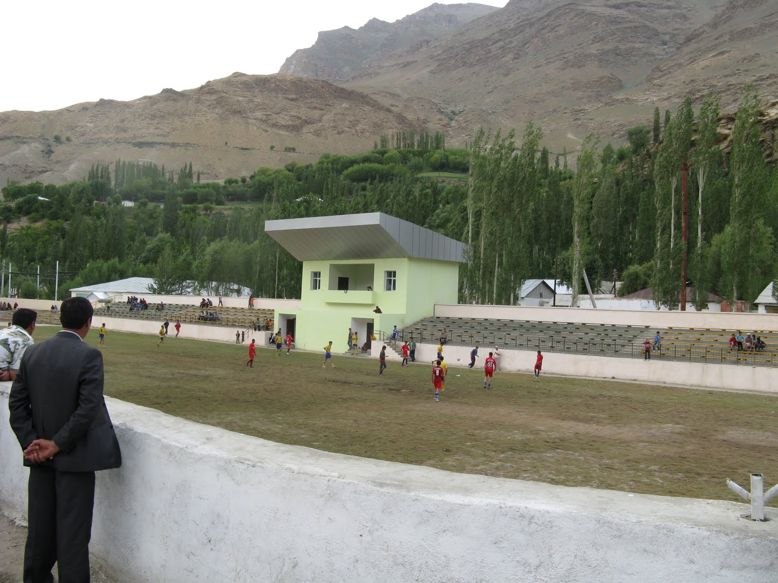 Nachdem wir gegessen haben, kommt ausnahmsweise ein Jeep runter gefahren. Wir winken zurück, der Jeep hält jedoch und eine ganze Horde kommt heraus und geht auf uns zu. Gibt wohl einen Plausch. Aber nein, sie wollen gleich unsere Pässe sehen. Das kommt mir spanisch vor, und ich verlange, dass sie sich ausweisen. Aber sie meinen, sie bräuchten sich nicht ausweisen, sie wären vom KGB. Nachdem sie einen recht überzeugenden Eindruck machen, kramen wir unsere Passkopien raus. Das GBAO-Permit hat es ihnen angetan und sie stellen sehr zu unserem Erstaunen fest, dass wir hier illegal unterwegs sind und keine Genehmigung haben. Das mögen wir erst nicht glauben. Aber im Endeffekt haben sie recht, auf dem GBAO-Stempel sind alle Distriktortschaften aufgeführt, nur Roshtkala nicht. Sie meinen wir müssten nun nach Khorog zurück und uns einen Permit holen. Darauf haben wir natürlich überhaupt keine Lust. Die Diskussion zieht sich in die Länge und irgendwann bin ich bereit auch ein bisschen Geld in den Ring zu werfen. Aber das wollen sie gar nicht, sie beharren auf ihrem Standpunkt. Wir machen uns gedanklich schon zähneknirschend auf den Rückweg, wie sollen wir dann zum Zor Kul? Über das Wakhan oder über den Pamir Highway und dann den Khargushpass? Irgendwann kommt dann erst einmal der Vorschlag auf, dass wir mit ihnen mitkommen sollen um einen Tee zu trinken. In der Ortschaft, die wir gerade passiert haben, hat einer der Männer ein Haus, es war wohl eh geplant bei ihm einzukehren. Wir fahren also zurück und müssen über eine recht wackelige Brücke auf die andere Flussseite. Im Haus wird dann erst einmal gross aufgetischt. Wegen des Permits meinten sie nun plötzlich, dass sich das nach dem Tee dann schon regelt. Allerdings haben wir ziemliche Mühe die vorgesetzten Speisen alle zu essen, dabei ist da auch gutes frisches Gemüse dabei. Am Reisteller esse ich über eine Stunde und komme Dina gar nicht nach. Aber sie muss sich auch geschlagen geben, ein Rest bleibt. Dafür leere ich einige Tassen Tee. Um den angebotenen Wodka kann ich mich noch herumwinden. Eventuell sind die Gastgeber froh darum, dann bleibt mehr für sie übrig. Nach drei geleerten Flaschen machen wir uns dann langsam sorgen, der Alkohol hinterlässt schon Spuren. Das Haus ist wie die meisten Häuser eingerichtet, es gibt auch Fernseher, Videoapparat und eine Videokamera. Zum Höhepunkt wird dann sogar zum Tanz eingesetzt.